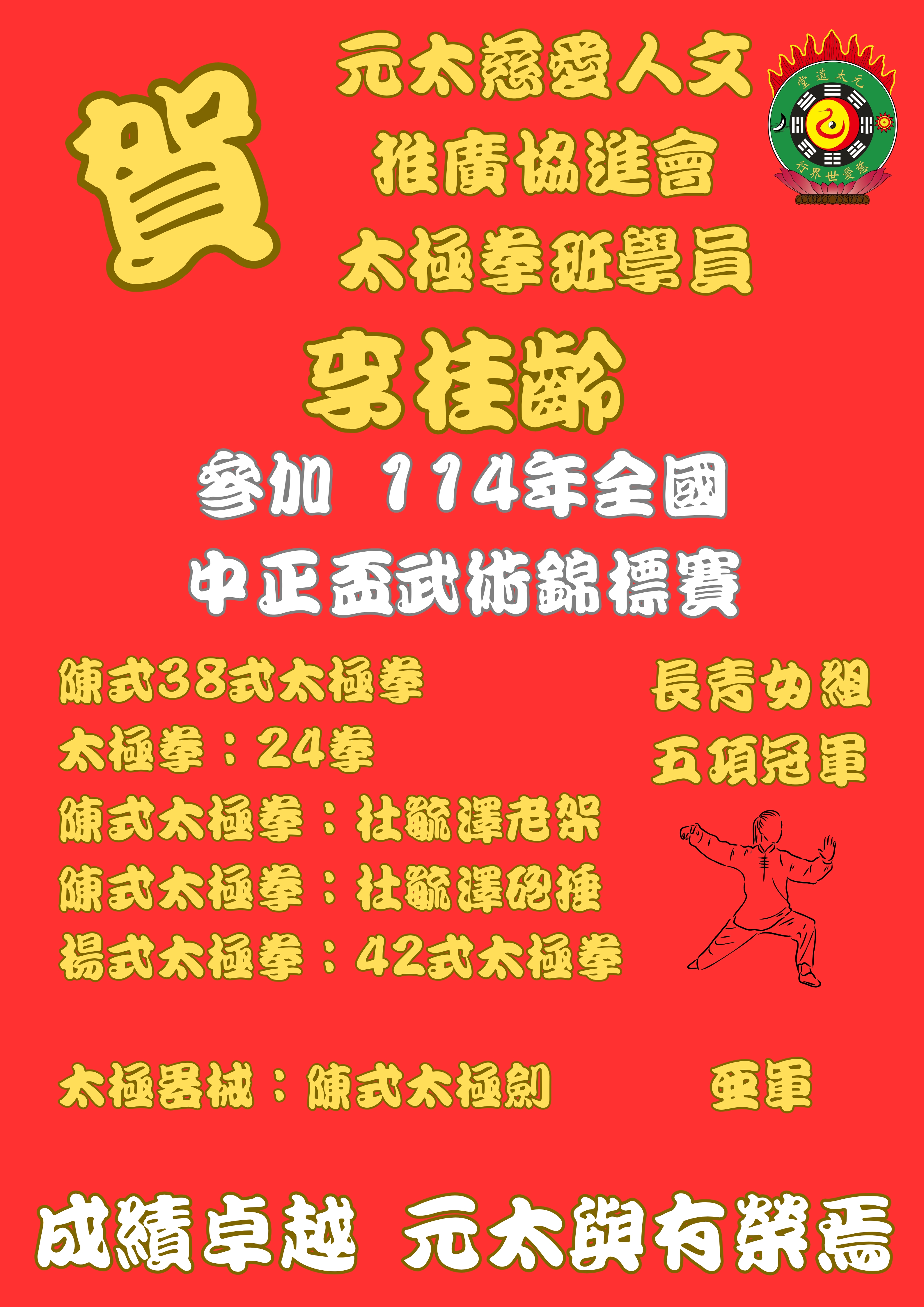 狂賀!元太太極拳班學員李桂齡114年全國中正盃武術錦標賽榮獲佳績
